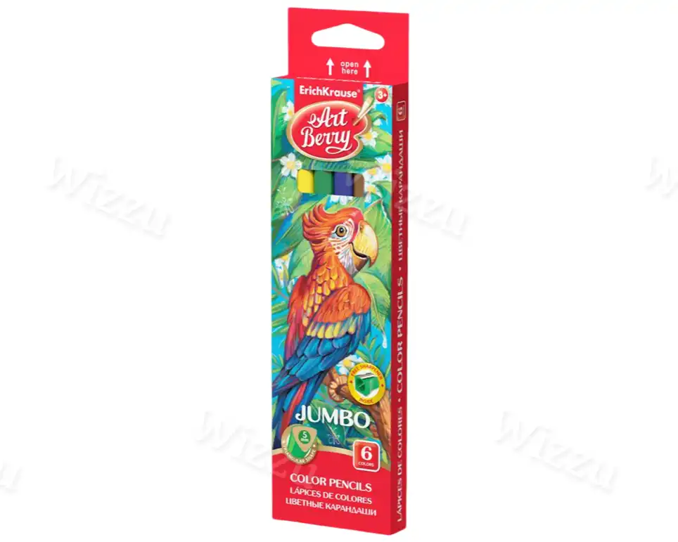 Цветные карандаши деревянные ArtBerry® Jumbo трехгранные, грифель 5 мм, 6 цветов с точилкой (в коробке с европодвесом 6 шт) Арт.32473